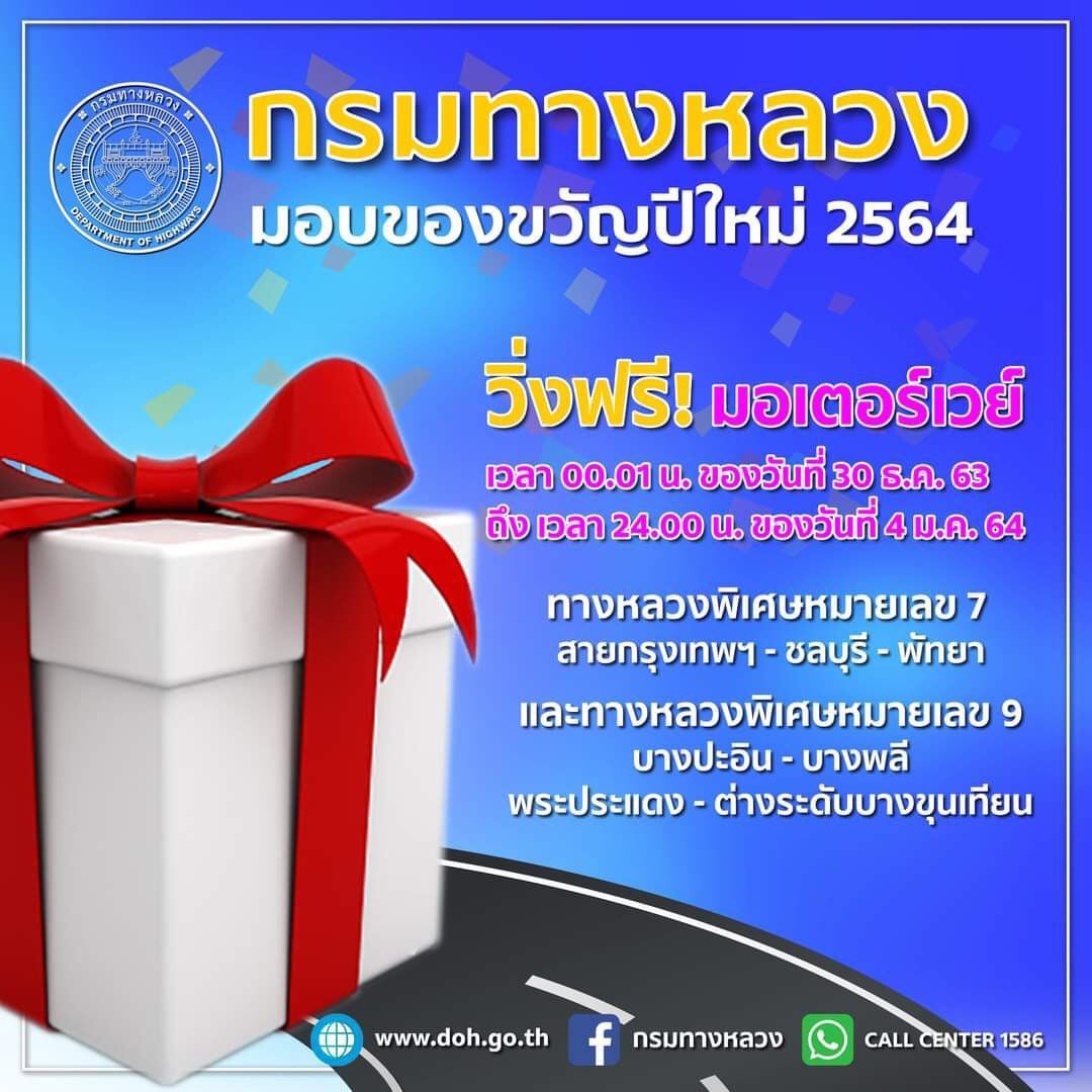 ทางด้านกรมทางหลวง นายสราวุธ ทรงศิวิไล อธิบดีกรมทางหลวง เปิดเผยว่า ในช่วงเทศกาลปีใหม่ระหว่างวันที่ 29 ธ.ค. 63 – 4 ม.ค. 64 กรมทางหลวงจะเปิดฟรีมอเตอร์เวย์บนทางหลวงพิเศษหมายเลข 7 กรุงเทพ – ชลบุรี – พัทยา และทางหลวงพิเศษหมายเลข 9 บางปะอิน – บางพลี พระประแดง – ต่างระดับบางขุนเทียนตั้งแต่เวลา 00.01 น. ของวันที่ 30 ธันวาคม 2563 ถึง เวลา 24.00 น. ของวันที่ 4 มกราคม 2564