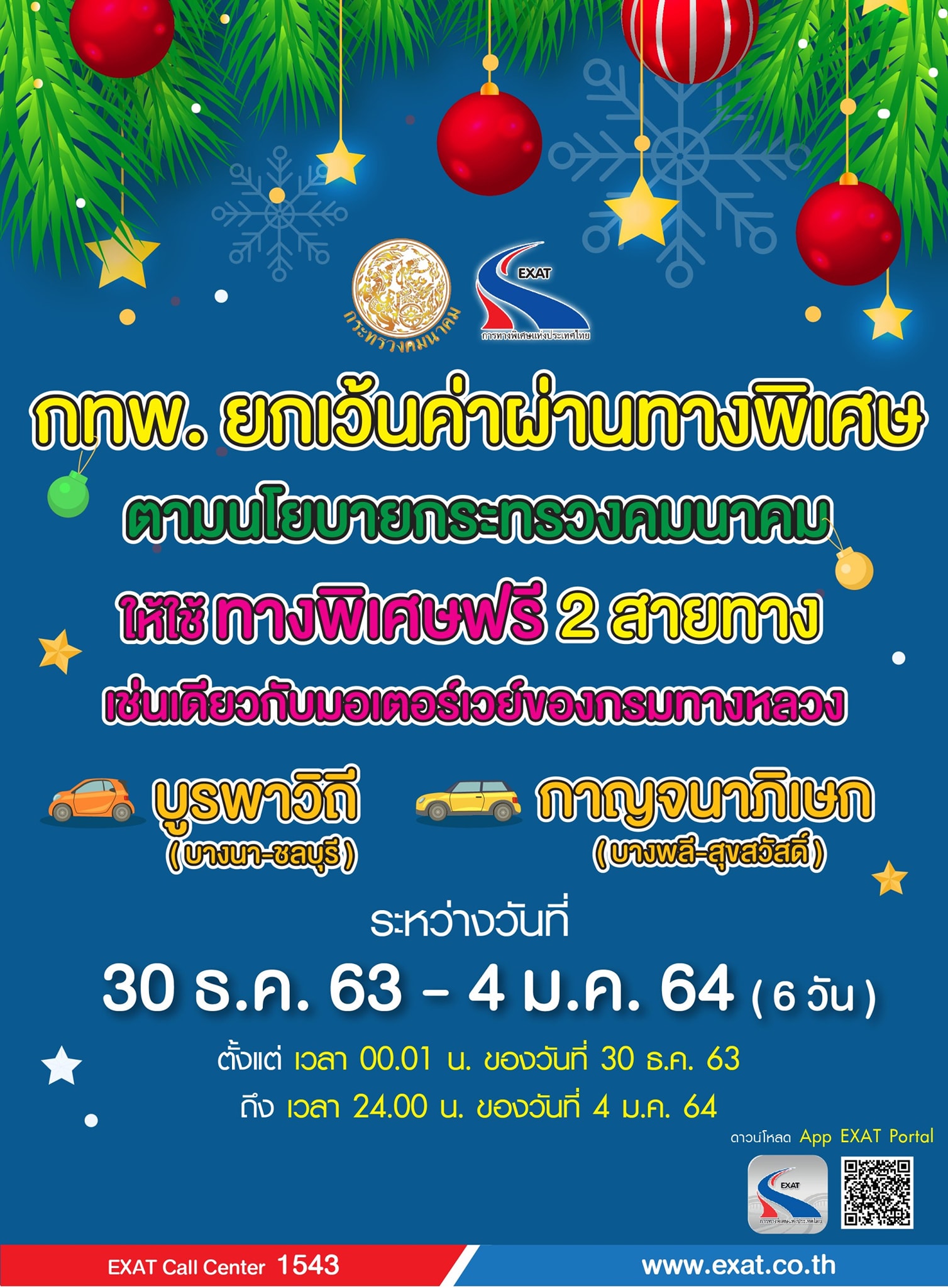ทั้งนี้ผู้ใช้ทางยังสามารถสอบถามข้อมูลการเดินทาง สภาพการจราจร และขอความช่วยเหลือจากศูนย์บริการข้อมูลผู้ใช้ทางพิเศษ EXAT Call Center โทร 1543 หรือขอความช่วยเหลือฉุกเฉิน (SOS) ผ่านทาง Application “EXAT Portal” ได้อีกช่องทางหนึ่งด้วย