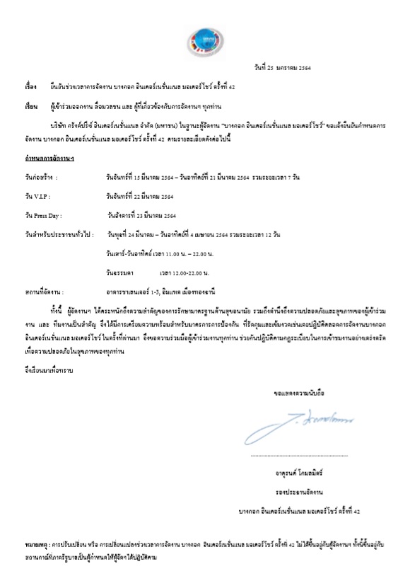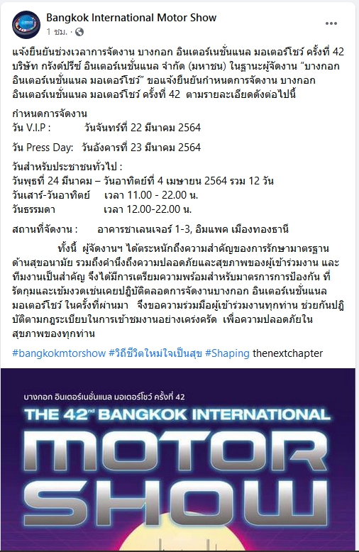 ล่าสุด บริษัท กรังด์ปรีซ์ อินเตอร์เนชั่นแนล จำกัด (มหาชน) ในฐานะผู้จัดงาน บางกอก อินเตอร์เนชั่นแนลมอเตอร์โชว์ ครั้งที่ 42 ได้ประกาศ แจ้งยืนยันกำหนดการจัดงาน บางกอก อินเตอร์เนชั่นแนล มอเตอร์โชว์ ครั้งที่ 42 ภายใต้แนวคิด SHAPING THE NEXT CHAPTER ระหว่างวันที่ 22 มีนาคม ถึง 4 เมษายน 2564 โดยมีรายละเอียดดังนี้ ณ อาคารชาเลนเจอร์ 1-3 อิมแพค เมืองทองธานี