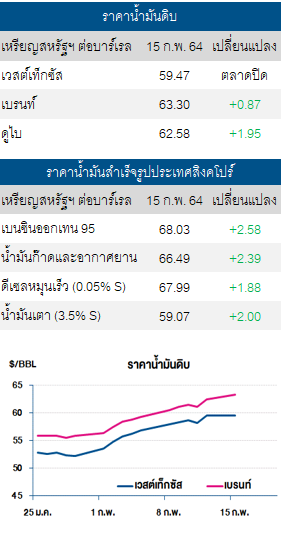 + ราคาน้ำมันดิบปรับเพิ่ม หลังความคาดหวังต่อมาตรการกระตุ้นเศรษฐกิจสหรัฐฯ มูลค่ากว่า 1.9 ล้านล้านเหรียญสหรัฐฯ มีแนวโน้มที่จะช่วยกระตุ้นเศรษฐกิจ การจ้างงานในสหรัฐฯ และหนุนความต้องการใช้น้ำมันให้ฟื้นตัวดีขึ้น