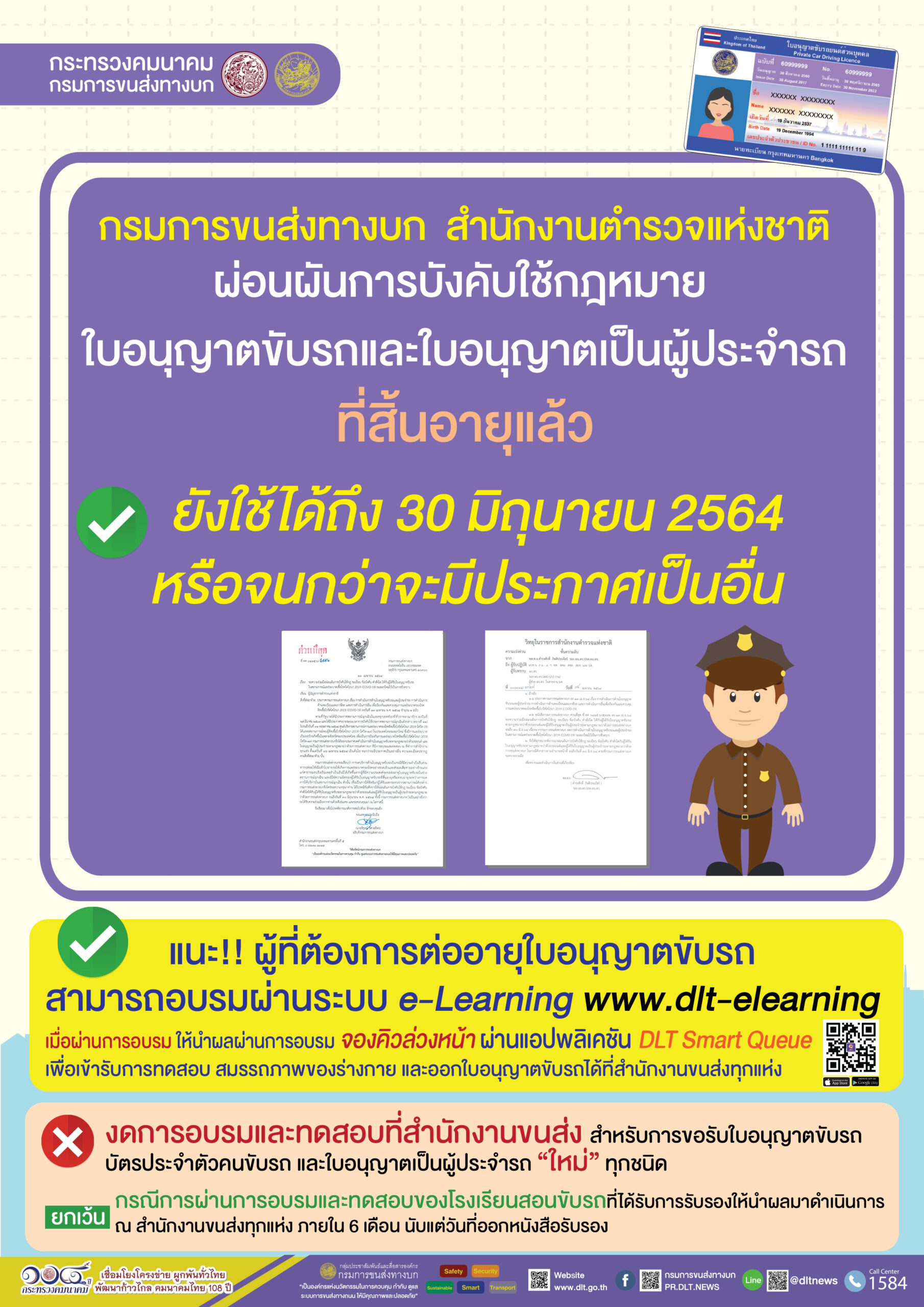ซึ่งมีโอกาสเสี่ยงสูงต่อการแพร่และติดต่อของโรคติดเชื้อไวรัสโคโรนา 2019 (COVID-19) พร้อมปรับการบริการที่สำนักงานขนส่งเพื่อลดความแออัด โดยให้จองคิวดำเนินการล่วงหน้าผ่านแอปพลิเคชั่น DLT Smart Queue ทำให้มีผู้ได้รับใบอนุญาตขับรถและใบอนุญาตเป็นผู้ประจำรถบางรายไม่สามารถดำเนินการต่ออายุภายในระยะเวลาที่กำหนดได้