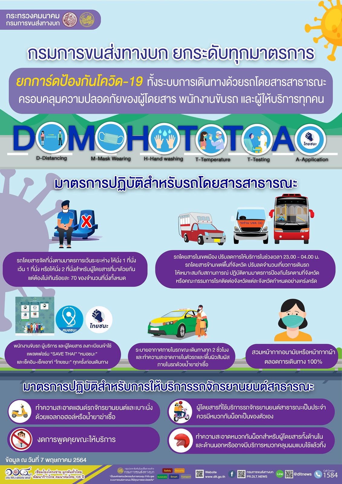 เพื่อความปลอดภัยของผู้ให้บริการขนส่งสาธารณะและสร้างความเชื่อมั่นให้แก่ผู้โดยสารที่ต้องการใช้บริการการเดินทางด้วยรถโดยสารสาธารณะทุกประเภท โดยยึดมาตรการทางด้านสาธารณสุข D-M-H-T-T-A อย่างเคร่งครัด และเพื่อให้เหมาะสมกับสถานการณ์ที่ต้องเพิ่มความระมัดระวังขั้นสูงสุด