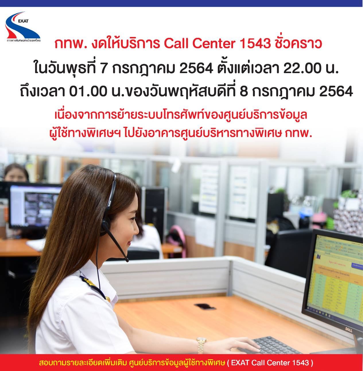 วันที่ 7 กรกฎาคม 2564 ผู้สื่อข่าวรายงานว่า การทางพิเศษแห่งประเทศไทย (กทพ.) กระทรวงคมนาคม จะทำการย้ายระบบโทรศัพท์ของศูนย์บริการข้อมูลผู้ใช้ทางพิเศษ (EXAT Call Center) หมายเลขโทรศัพท์ 1543 จาก กทพ. สำนักงานใหญ่ (เดิม) จตุจักร ไปยังอาคารศูนย์บริหารทางพิเศษ กทพ. ซึ่งการย้ายระบบโทรศัพท์ดังกล่าวมีความจำเป็นต้องปิดระบบโทรศัพท์หมายเลข 1543 ในวันพุธที่ 7 กรกฎาคม 2564 ตั้งแต่เวลา 22.00 น. ถึงเวลา 01.00 น. ของวันพฤหัสบดีที่ 8 กรกฎาคม 2564 ส่งผลให้ในช่วงวันและเวลาดังกล่าวผู้ใช้บริการจะไม่สามารถโทรศัพท์ติดต่อหมายเลขโทรศัพท์ 1543 ได้
