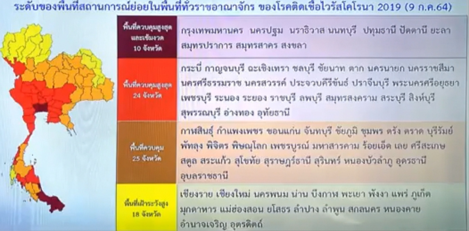 วันที่ 9 กรกฎาคม 2564 นายศักดิ์สยาม ชิดชอบ รัฐมนตรีว่าการกระทรวงคมนาคม เปิดเผยว่า ที่ประชุมหัวหน้าหน่วยงานภายในกระทรวงคมนาคม ได้มีมติตามที่ประชุมศูนย์บริหารสถานการณ์แพร่ระบาดของโรคติดเชื้อไวรัส โคโรนา 2019 (ศบค.) ที่มีพลเอกประยุทธ์ จันทร์โอชา นายกรัฐมนตรีเป็นประธาน โดยมีมติงดการให้บริการรถโดยสารขนส่งสาธารณะในพื้นที่ควบคุมสูงสุดเข้มงวด 10 จังหวัด ประกอบด้วย กรุงเทพ, นนทบุรี, ปทุมธานี, สมุทรปราการ, สมุทรสาคร, นครปฐม, นราธิวาส, ปัตตานี, สงขลา และยะลา ตั้งแต่เวลา 21.30-04.00 น. เว้นรถที่มีความจำเป็น เช่น รถที่ใช้งานด้านขนส่ง หรือรถฉุกเฉิน เช่น รถพยาบาล กู้ภัย เป็นต้น มีผลวันที่ 12 กรกฎาคม 2564 นี้ โดยให้หน่วยงานที่เกี่ยวข้องรายงานผลการดำเนินการทุกวัน
