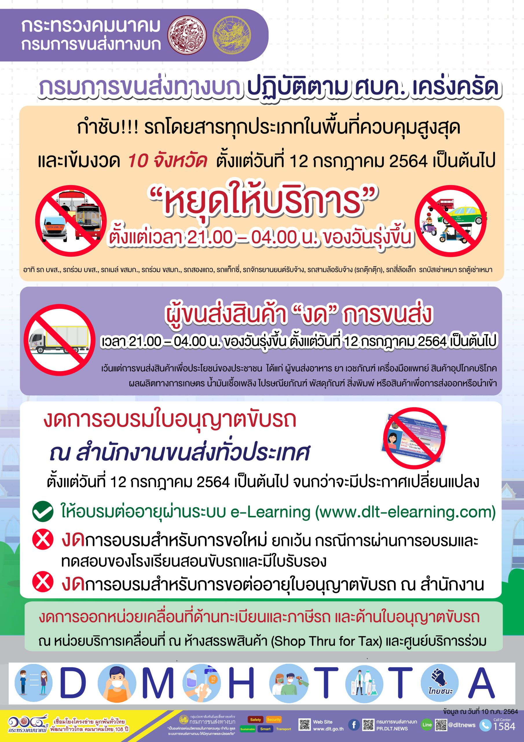 สำหรับการให้บริการด้านใบอนุญาตขับรถทั่วประเทศยังคงให้บริการประชาชนอย่างต่อเนื่อง แต่สำหรับการดำเนินการที่มีความเสี่ยงต่อการแพร่กระจายเชื้อ กรมการขนส่งทางบก จึงมีความจำเป็นต้องของดให้บริการเฉพาะบางกิจกรรมที่ต้องเข้ารับการอบรม ณ สำนักงานขนส่ง ตั้งแต่วันที่ 12 กรกฎาคม 2564 เป็นต้นไป จนกว่าจะมีประกาศเปลี่ยนแปลง ดังนี้