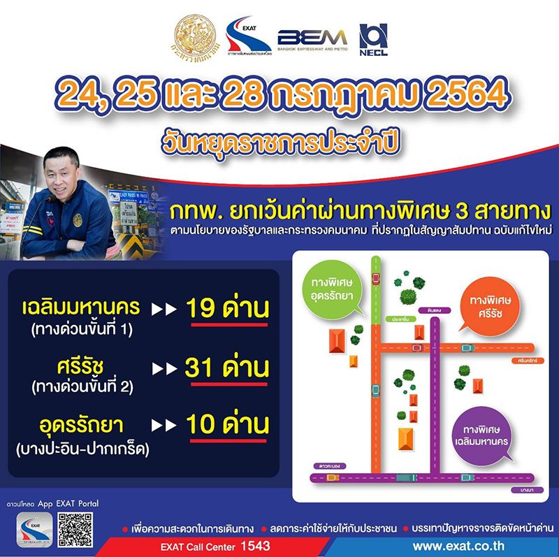 ฃโดยทั้ง 3 วัน เป็นวันหยุดราชการประจำปีตามประกาศสำนักนายกรัฐมนตรี โดยเป็นไปตามนโยบายของรัฐบาลและกระทรวงคมนาคมที่ปรากฏในสัญญาสัมปทาน ฉบับแก้ไขใหม่ระหว่าง กทพ. บริษัท ทางด่วนและรถไฟฟ้ากรุงเทพ จำกัด (มหาชน) (BEM) และบริษัท ทางด่วนกรุงเทพเหนือ จำกัด (NECL) เพื่อช่วยลดภาระค่าใช้จ่ายให้แก่ประชาชน