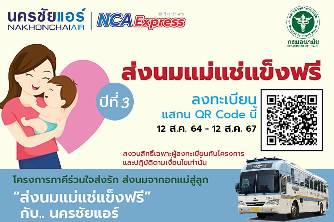 ในการนี้นครชัยแอร์เข้าร่วมโครงการต่อเนื่องให้บริการส่งน้ำนมแม่ ฟรี ไปกับรถรับ-ส่งพัสดุของนครชัยแอร์ (ทั้งขาไป-กลับ) เพื่อดำเนินการจัดส่งน้ำนมแม่ถึงปลายทางภายใน 24 ชั่วโมง พร้อมอำนวยความสะดวกในการส่งน้ำนมแช่แข็งและช่วยลดค่าใช้จ่ายในการจัดส่ง