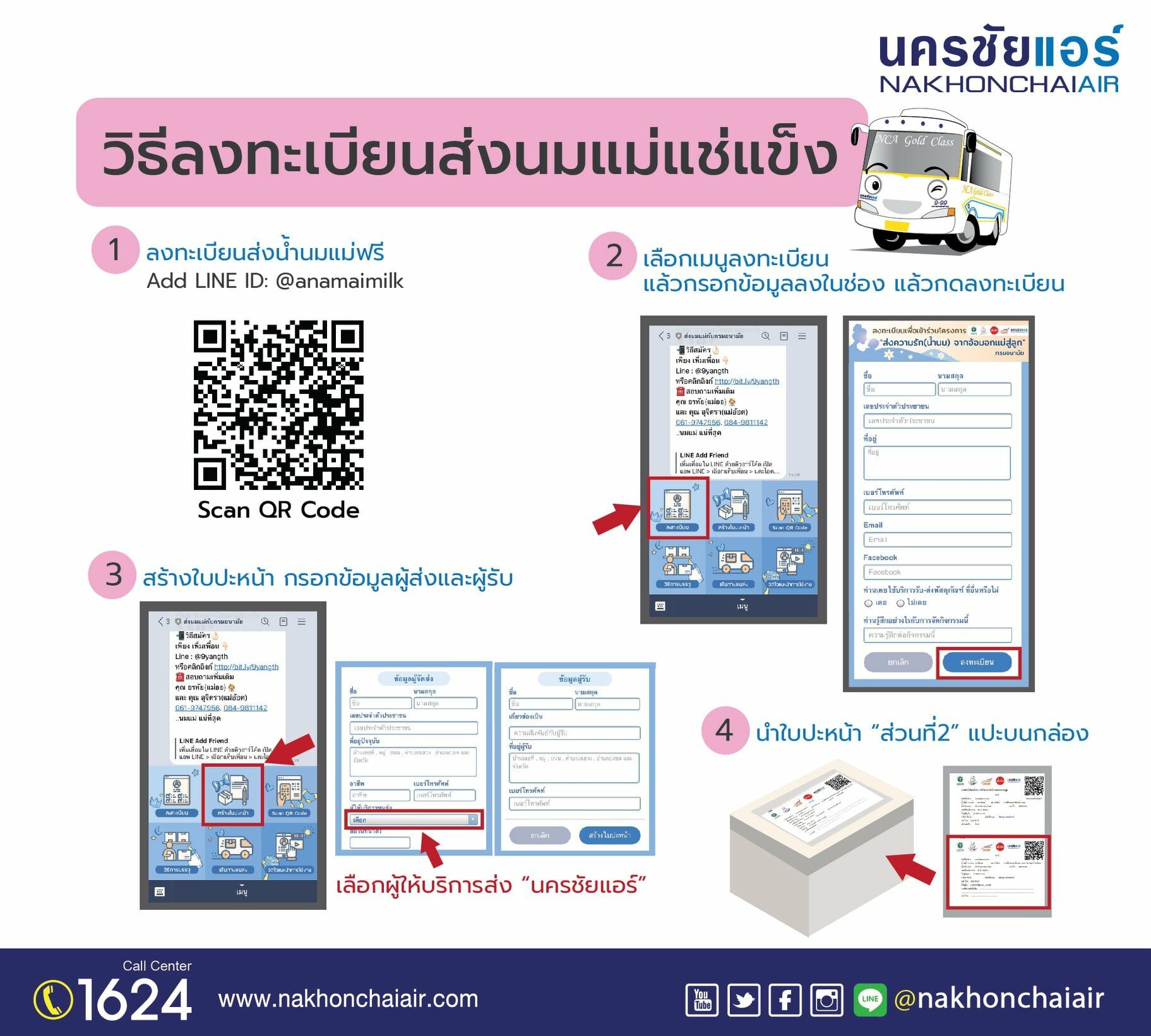 สำหรับวิธีการลงทะเบียนเข้าร่วมโครงการภาคีร่วมใจส่งรัก ส่งนมจากอกแม่สู่ลูก เพียง Scan QR Code หรือ Line@ พิมพ์ @anamaimilk เพื่อลงทะเบียนเข้าร่วมโครงการ กรอกข้อมูล ชื่อ – นามสกุล , หมายเลขบัตรประชาชน , เบอร์โทรศัพท์ , อีเมล์ , Facebook และกดลงทะเบียนเข้าร่วมโครงการ พร้อมศึกษาวิธีแพ็คน้ำนมแม่แบบแห้งที่ถูกต้องตามขั้นตอนของโครงการฯ จากนั้นกดสร้างใบปะหน้า กรอกข้อมูลผู้จัดส่งและ ข้อมูลผู้รับให้ถูกต้องครบถ้วน และกด “สร้างใบปะหน้า” เพื่อพิมพ์นำแบบฟอร์มลงทะเบียนเข้าร่วมโครงการติดที่ข้างกล่องโฟม