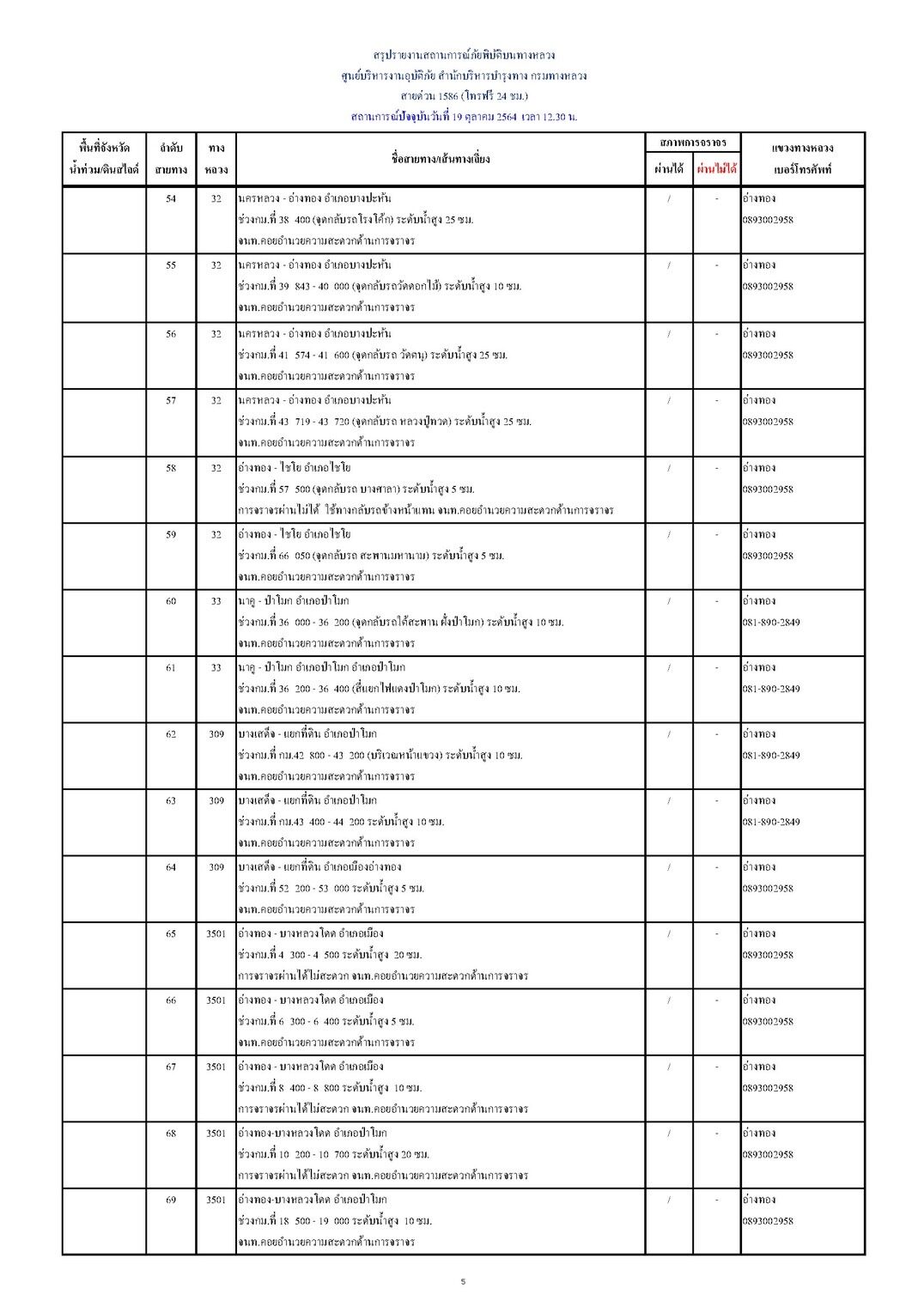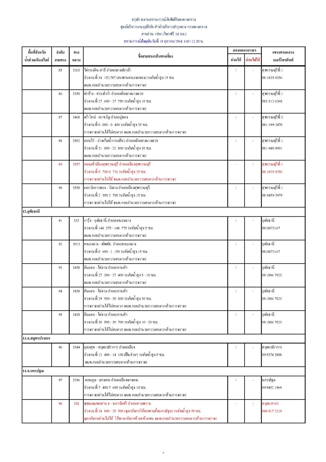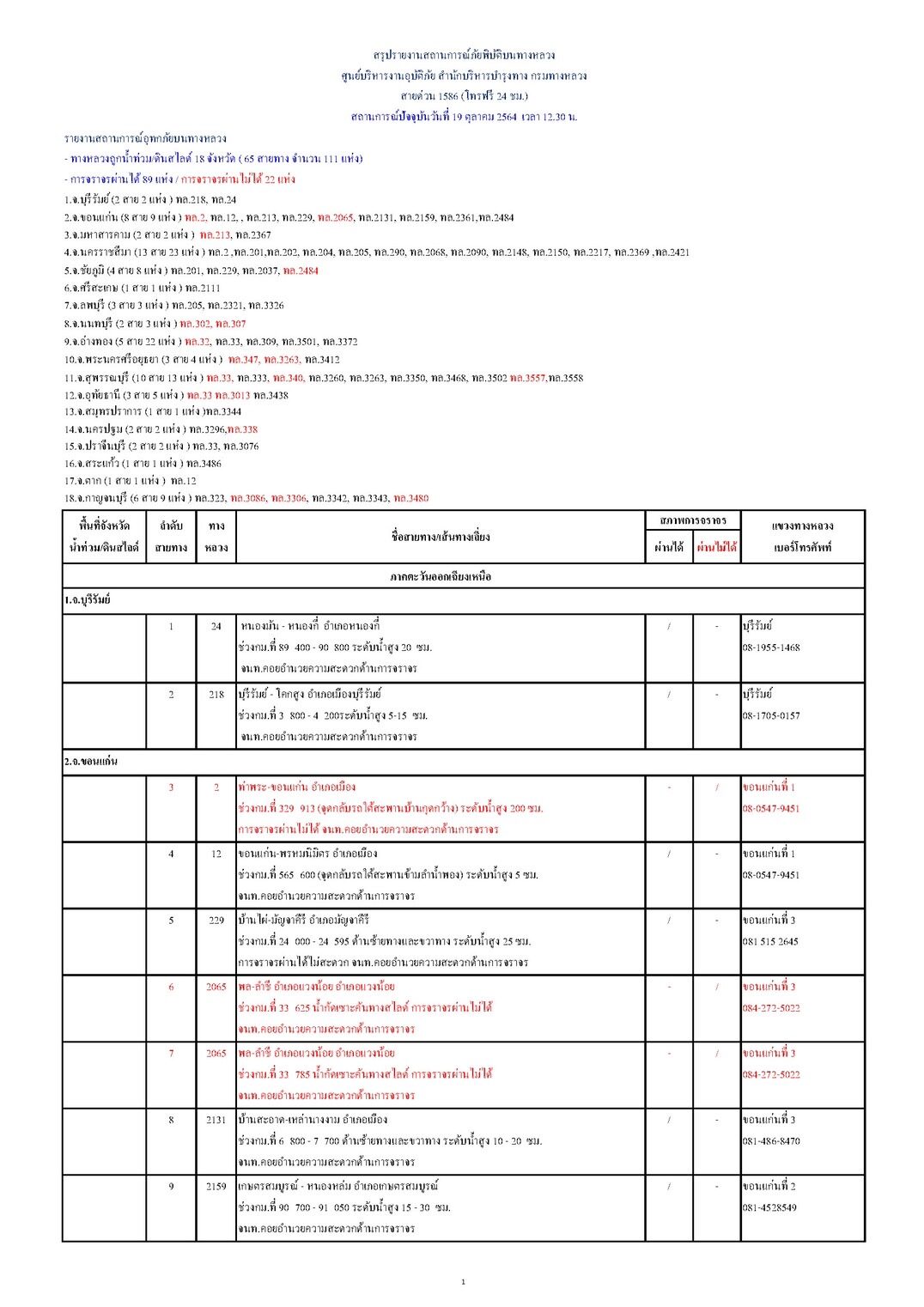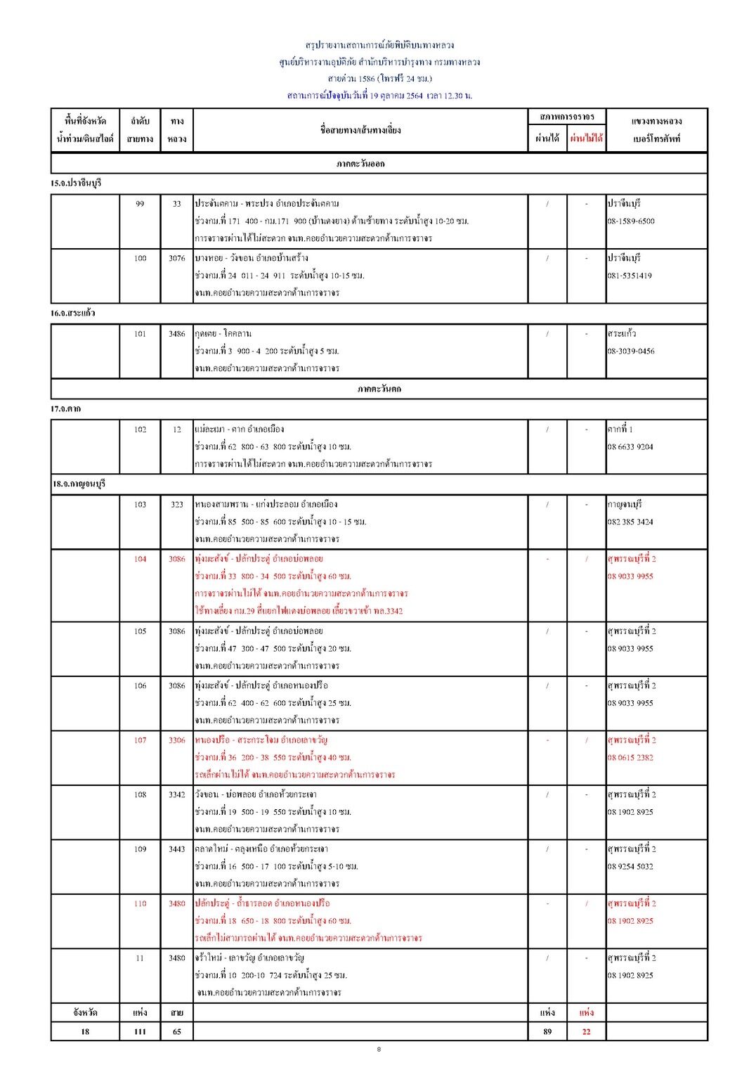 กรมทางหลวงขอรายงานสถานการณ์ น้ำท่วม และดินสไลด์ ในโครงข่ายทางหลวง วันอังคารที่ 19 ตุลาคม 2564 เวลา 12.30 น. ดังนี้ น้ำท่วม/ดินสไลด์ 18 จังหวัด รวม 111 แห่ง การจราจรผ่านได้ 89 แห่ง และผ่านไม่ได้ 22 แห่ง