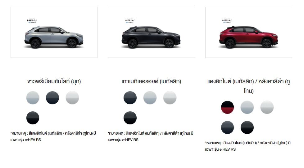 ตัวถังของ Honda HR-V รุ่น RS มีให้เลือกทั้งหมด 5 สี ประกอบด้วย สีแดงอิกไนต์หลังคาดำ, สีขาวพรีเมียมซันไลท์, สีเทาเมทิเออรอยด์, สีขาวแพลทินัม และสีดำคริสตัล