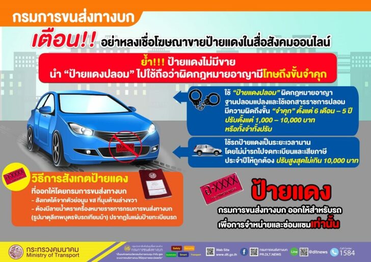 ขนส่งเตือน! อย่าหลงเชื่อโฆษณาขายป้ายแดงทางออนไลน์ ย้ำ! ป้ายแดงไม่มีขาย ซื้อไปใช้ถือว่าผิดกฎหมาย