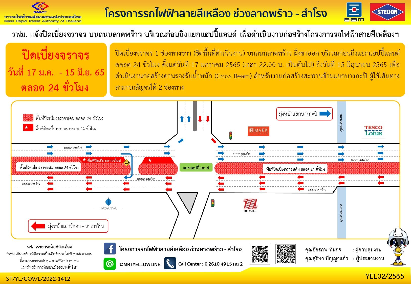 การรถไฟฟ้าขนส่งมวลชนแห่งประเทศไทย(รฟม.)แจ้งว่า บริษัท ซิโน-ไทย เอ็นจีเนียริ่ง แอนด์ คอนสตรัคชั่น จำกัด (มหาชน) ผู้รับจ้างก่อสร้างงานโยธา โครงการรถไฟฟ้าสายสีเหลืองช่วงลาดพร้าว – สำโรง มีความจำเป็นต้องปิดเบี่ยงจราจร 1 ช่องทางขวา (ชิดพื้นที่ดำเนินงาน) บนถนนลาดพร้าว ฝั่งขาออก บริเวณก่อนถึงแยกแฮปปี้แลนด์ ตลอด 24 ชั่วโมง ตั้งแต่วันที่ 17 มกราคม 2565 (เวลา 22.00 น. เป็นต้นไป) ถึงวันที่ 15 มิถุนายน 2565 เพื่อดำเนินงานก่อสร้างคานรองรับน้ำหนัก (Cross Beam) สำหรับงานก่อสร้างสะพานข้ามแยกบางกะปิ ผู้ใช้เส้นทางสามารถสัญจรได้ 2 ช่องทาง