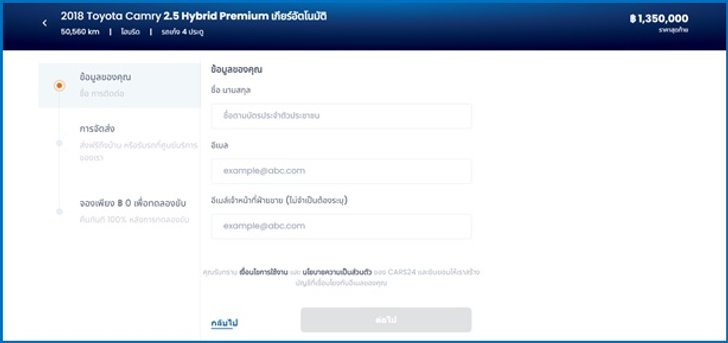 จากนั้นรอเจ้าหน้าที่ติดต่อยืนยันการจองรถทดลองขับ เพียงเท่านี้คุณก็ได้ทดลองขับรถที่คุณสนใจ ให้คุณทดลองขับได้ถึงหน้าบ้าน โดยไม่จำเป็นต้องเดินทางออกจากบ้านไปยัง Showroom มีเวลาพิจารณาและตรวจสอบสภาพรถอย่างเต็มที่ โดยบริการทั้งหมดนี้นั้นไม่มีค่าใช้จ่ายแต่อย่างใด ซึ่งถ้าเกิดถูกใจรถคันนี้จริงๆหลังจากได้ลองขับแล้วสามารถคุยกับทีมขายของ CARS24 ได้เลย โดย CARS24 มีทีมขายที่พร้อมให้บริการเต็มที่ เพียงแค่วางเงินมัดจำแล้วทีมขายของ CARS24 จะจัดการต่อให้เอง ที่ CARS24 เราเข้าใจดีว่าการเลือกรถซักคันนั้นไม่ใช่เรื่องง่าย ด้วยบริการทดลองขับแบบส่งรถถึงหน้าบ้านโดยไม่มีค่าใช้จ่ายของ CARS24 นั้นจะเป็นทางเลือกที่สะดวกสบายที่จะช่วยในการตัดสินใจเลือกซื้อรถให้กับทุกท่าน