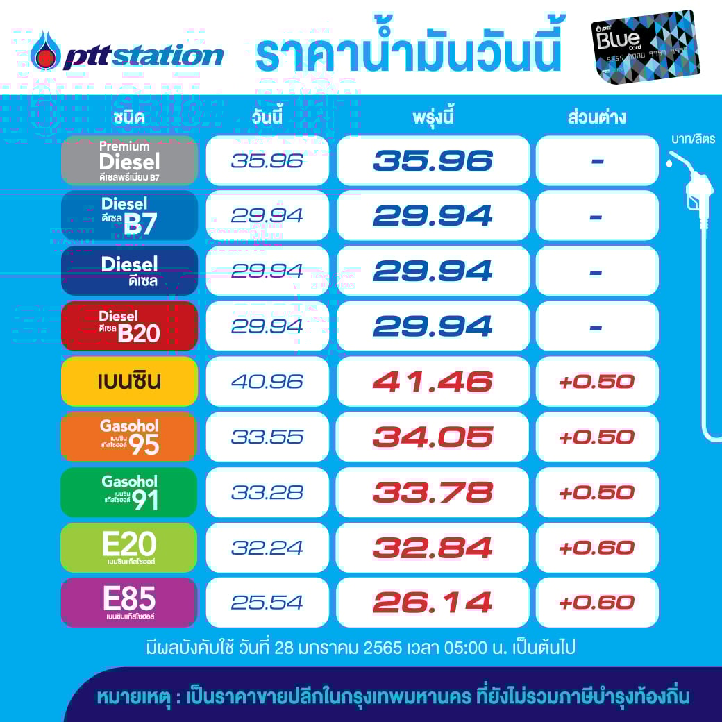 27 ม.ค. 2565 – บริษัท ปตท.น้ำมันและการค้าปลีก จำกัด(มหาชน) และ บมจ.บางจาก ได้มีการประกาศปรับราคาขายปลีกน้ำมันเบนซินและแก๊สโซฮอล์ทุกชนิดขึ้น 50 สตางค์/ลิตร ยกเว้น E20 และ E85 ปรับขึ้น 60 สตางค์/ลิตร ส่วนกลุ่มดีเซลทุกชนิดราคาคงเดิม มีผลตั้งแต่วันที่ 28 ม.ค. 2565 เวลา 05.00 น.