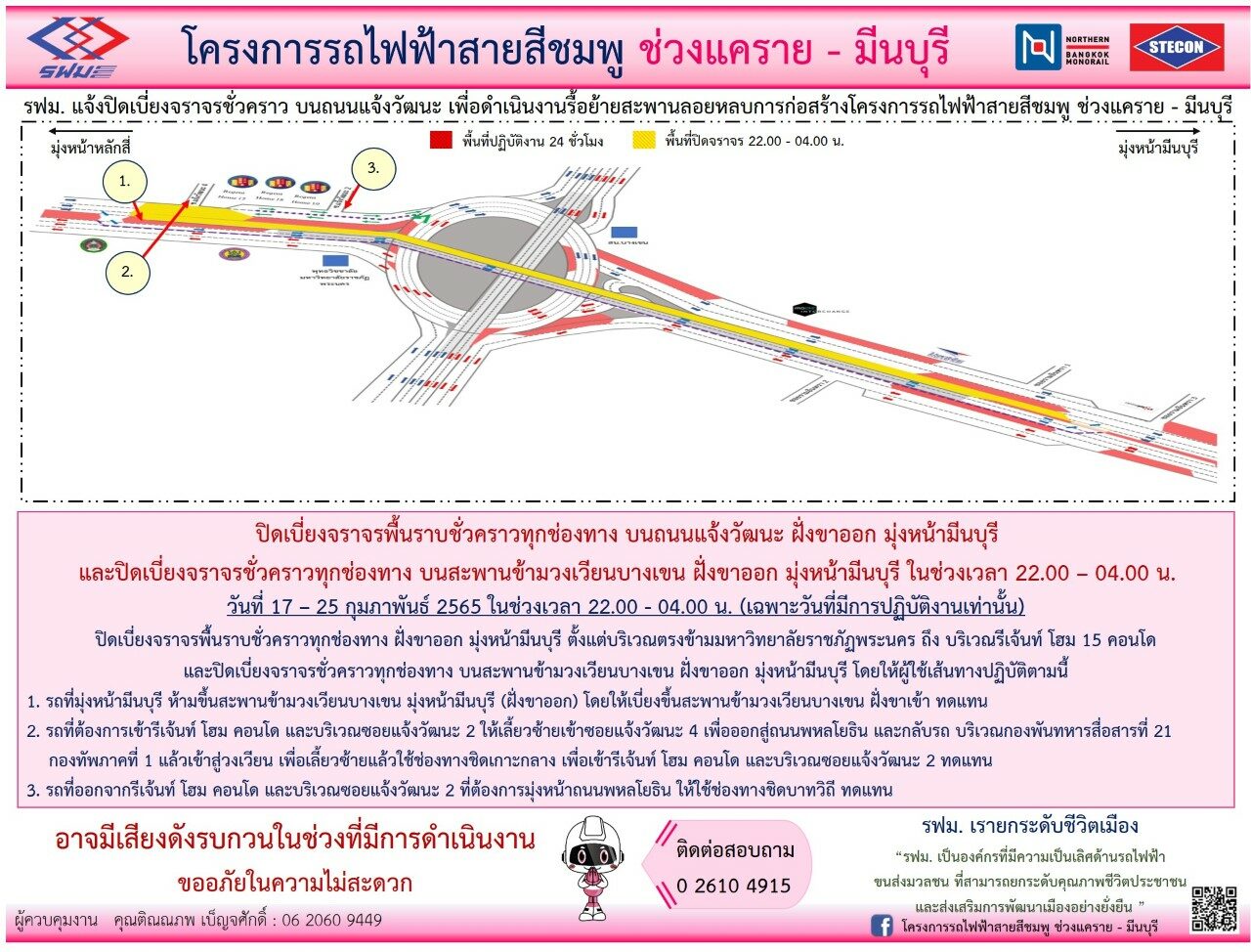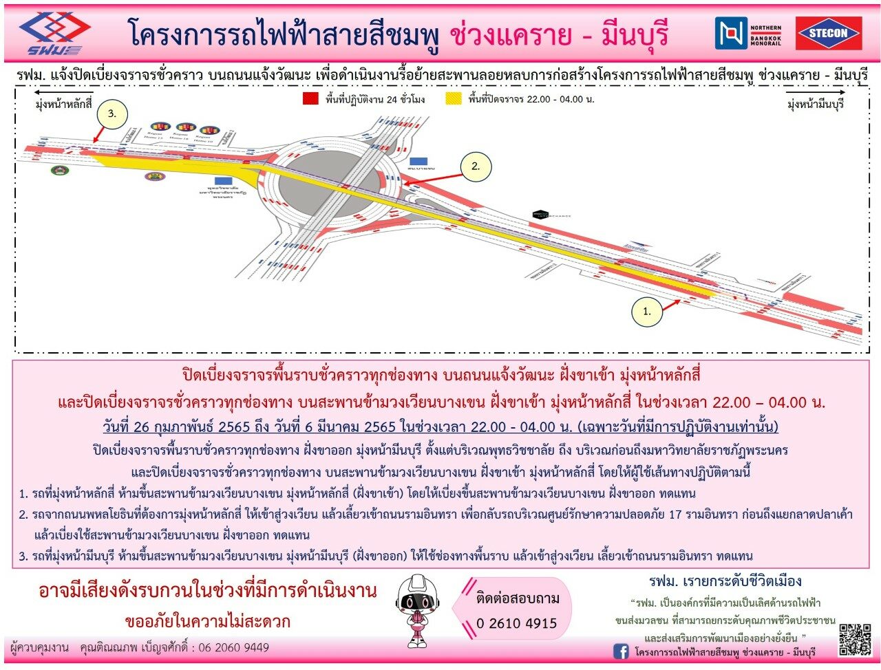 รฟม.แจ้งปิดเบี่ยงจราจรชั่วคราวทุกช่องทาง บนถนนแจ้งวัฒนะ ฝั่งขาเข้าและฝั่งขาออกและบนสะพานข้ามวงเวียนบางเขน ฝั่งขาเข้าและฝั่งขาออก เพื่อดำเนินงานรื้อย้ายสะพานลอยหลบการก่อสร้าง โครงการรถไฟฟ้าสายสีชมพู ช่วงแคราย-มีนบุรี
