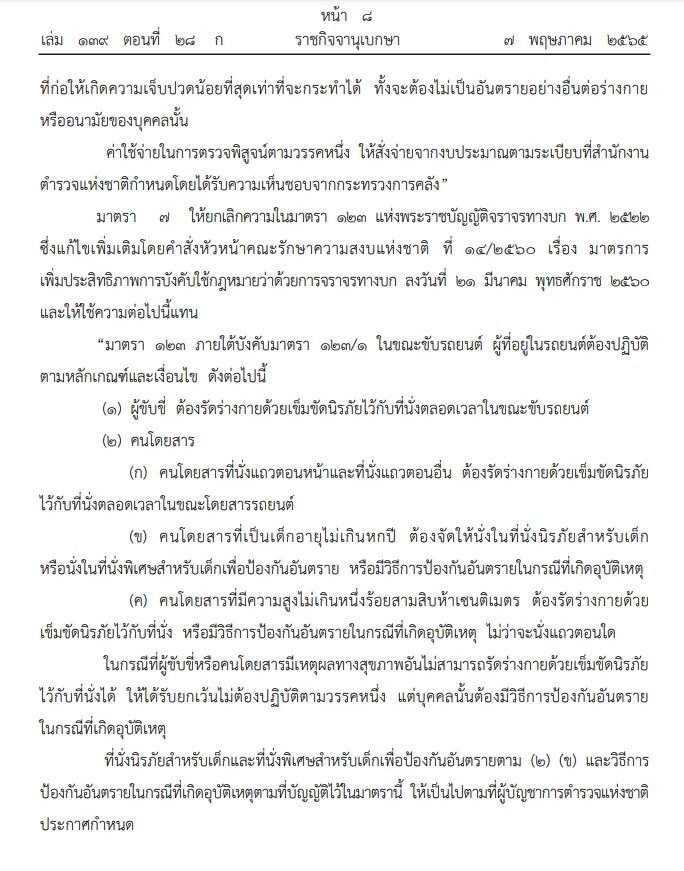 มาตรา 8 ให้เพิ่มความต่อไปนี้เป็นมาตรา 123/1 มาตรา 123/2 และมาตรา 123/3 แห่งพ.ร.บ.จราจรทางบก พ.ศ.2522 มาตรา 123/1 ในการใช้รถนั่งสองแถว รถบรรทุกคนโดยสารขนาดเล็กที่มีการจัดที่นั่ง ตามความยาวของรถ รถกระบะ รถกึ่งกระบะ หรือรถยนต์อื่นตามที่ผู้บัญชาการตำรวจแห่งชาติ