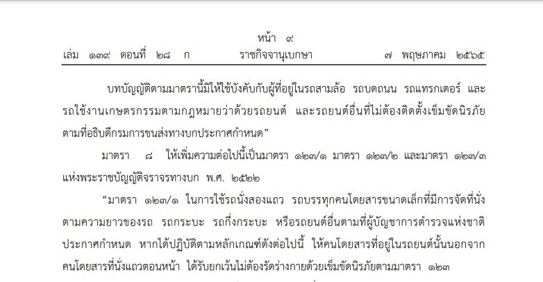 บทบัญญัติตามมาตรานี้มิให้ใช้บังคับกับผู้ที่อยู่ในรถสามล้อ รถบดถนน รถแทรกเตอร์ และ รถใช้งานเกษตรกรรมตามกฎหมายว่าด้วยรถยนต์ และรถยนต์อื่นที่ไม่ต้องติดตั้งเข็มขัดนิรภัย ตามที่อธิบดีกรมการขนส่งทางบกประกาศกำหนด
