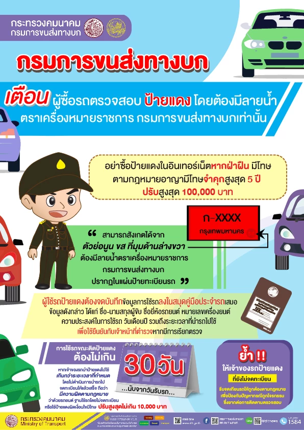 นายเสกสม อัครพันธุ์ รองอธิบดีกรมการขนส่งทางบก และโฆษกกรมการขนส่งทางบก (ขบ.) กล่าวว่า กรมฯขอเตือนประชาชนอย่าหลงเชื่อซื้อป้ายแดงในอินเทอร์เน็ต โดยป้ายแดง คือ ป้ายทะเบียนที่กรมการขนส่งทางบกออกให้บริษัทตัวแทนจำหน่ายรถที่ได้รับใบอนุญาต ใช้ติดรถเพื่อนำรถไปส่งให้ลูกค้าหรือนำรถไปซ่อมแซม และอนุโลมให้ใช้ได้ระหว่างดำเนินการจดทะเบียนรถ ไม่เกิน 30 วัน ซึ่งเป็นเอกสารของทางราชการ