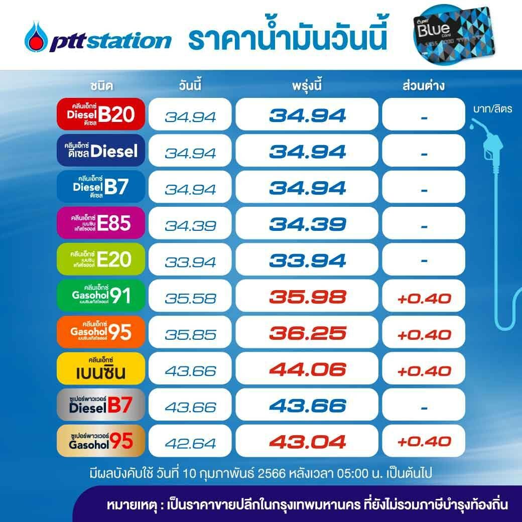 เมื่อเวลา 17.00 น. วัน 9 กุมภาพันธ์ PTT Station แจ้งปรับราคาขายปลีกน้ำมันกลุ่มเบนซินและแก๊สโซฮอล์ทุกชนิดขึ้น 0.40 บาท/ลิตร เว้น E20, E85 และ กลุ่มดีเซลคงเดิม มีผล 10 ก.พ. 2566 เวลา 05.00 น. เป็นต้นไป โดยราคาขายปลีกจะเป็นดังนี้ ULG = 44.06, GSH95 = 36.25, E20 = 33.94, GSH91 = 35.98, E85 = 34.39, พรีเมี่ยม GSH95 = 43.04, HSD-B7 = 34.94, HSD-B10 = 34.94, HSD-B20 = 34.94, พรีเมี่ยมดีเซล B7 = 43.66 บาทต่อลิตร โดยราคาขายปลีกข้างต้นยังไม่รวมภาษีบำรุงกรุงเทพมหานคร
