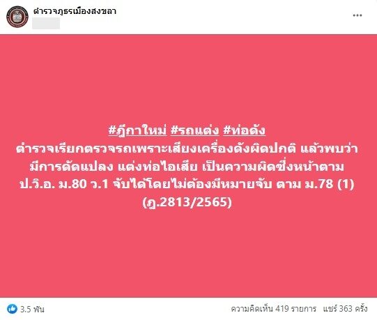 ไม่เพียงแค่นั้น เพจ “ตำรวจภูธรเมืองสงขลา” ก็ออกโรงเตือนเบาๆ ถึงการดัดแปลงรถจนส่งเสียงดัง