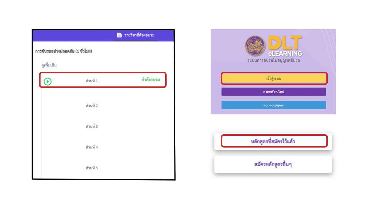 7. ในกรณีที่ไม่สามารถรับชมวิดีโอจนครบทุกพาร์ท สามารถกดออกจากระบบได้ และล็อกอินเข้าสู่ระบบใหม่ผ่านทางเว็บไซต์ www.dlt-elearning.com เช่นเดิม หลังจากนั้นให้เลือก "หลักสูตรที่สมัครไว้แล้ว" เพื่อรับชมและฟังการอบรมใบขับขี่ออนไลน์จนครบทุกพาร์ท