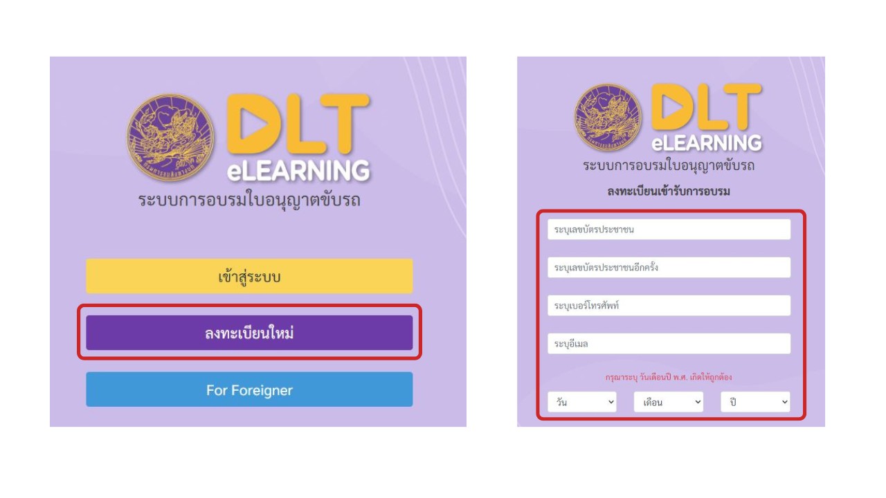 1. เข้าอบรมต่อใบขับขี่ออนไลน์ 2566 ผ่านทางเว็บไซต์ www.dlt-elearning.com แล้วเลือก "ลงทะเบียนใหม่"
