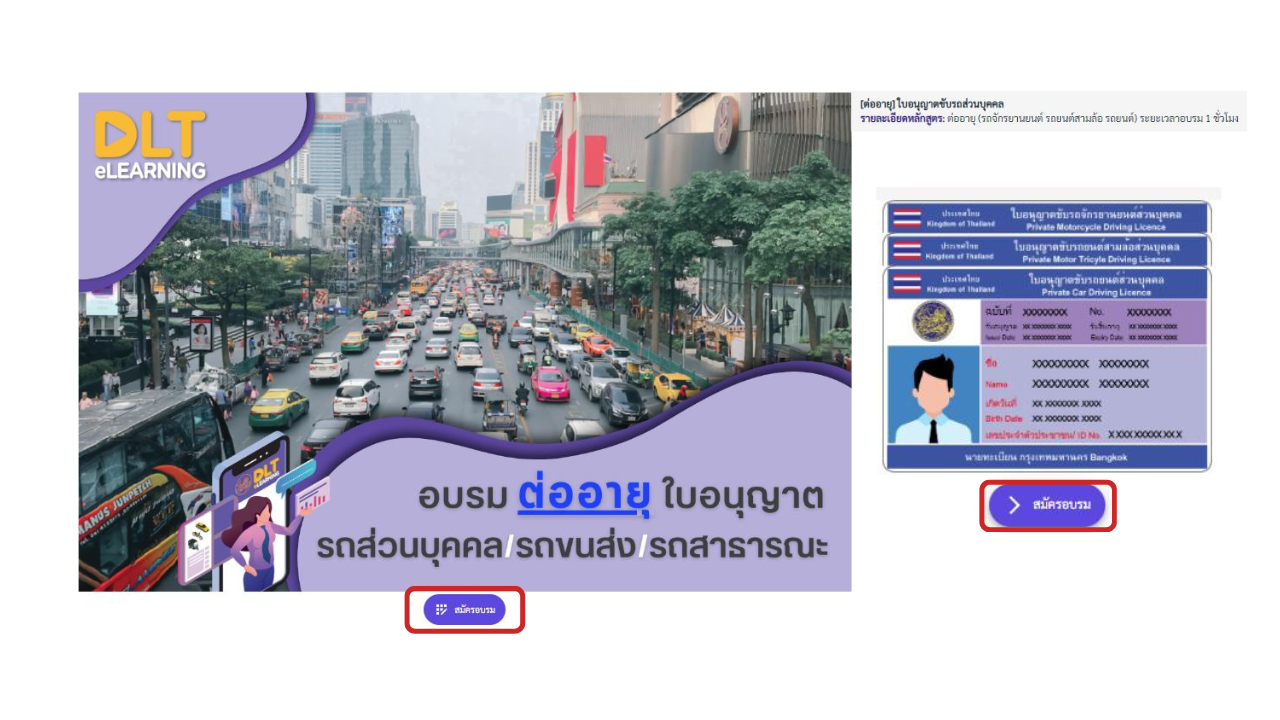 3. เมื่อเข้าสู่ระบบได้แล้ว ให้เลือกชนิดใบอนุญาตขับขี่ที่ต้องการอบรมออนไลน์ ในกรณีนี้เลือก "อบรมต่ออายุใบอนุญาตรถส่วนบุคคล/รถขนส่ง/รถสาธารณะ" ซึ่งจะมีรายละเอียดของหลักสูตรเขียนกำกับไว้ โดยเลือกให้ตรงกับประเภทของใบขับขี่ที่เราต้องการต่ออายุ หลังจากนั้นเลือก "สมัครอบรม"