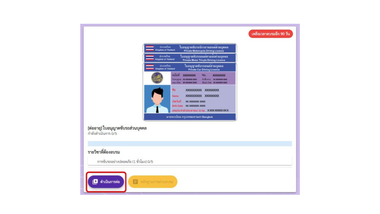 4. เมื่อกดสมัครอบรมเรียบร้อยแล้ว มีเงื่อนไขกำหนดว่า เราต้องเข้าไปอบรมให้เสร็จภายใน 90 วัน พร้อมระบุรายวิชาที่ต้องเข้าอบรมว่า มีเนื้อหาเกี่ยวกับอะไร ให้เลือก "ดำเนินการต่อ" เพื่อเริ่มฟังการอบรมใบขับขี่ออนไลน์ 2566