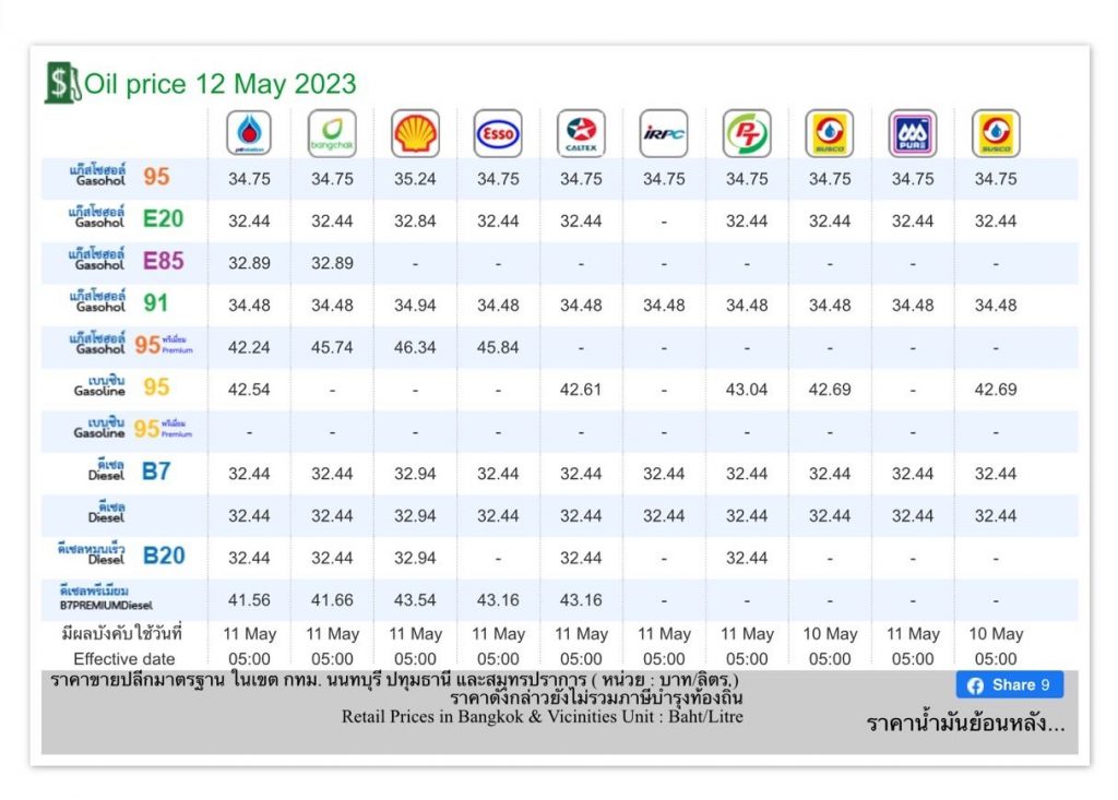 เมื่อวันที่ 12 พฤษภาคม สำนักงานนโยบายและแผนพลังงาน กระทรวงพลังงาน ได้รายงานสถานการณ์ราคาน้ำมันขายปลีกหน้าสถานีบริการของผู้ค้าปลีกรวม 10 ราย ณ วันที่ 9 พฤษภาคม 2566 ทั้งกลุ่มน้ำมันเบนซิน กลุ่มแก๊สโซฮอล์