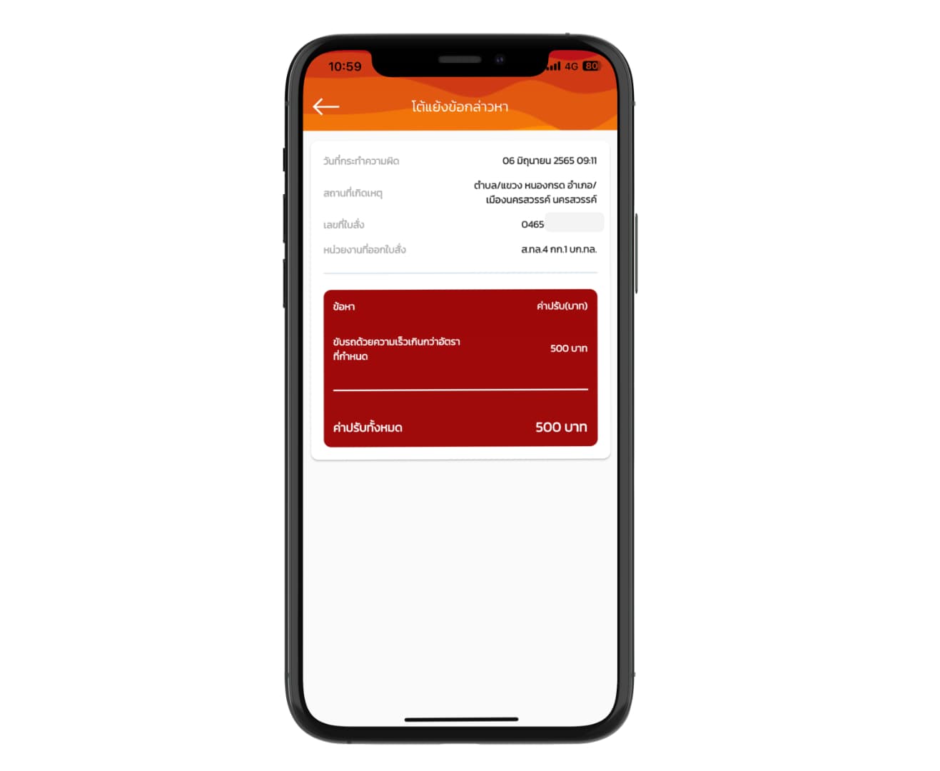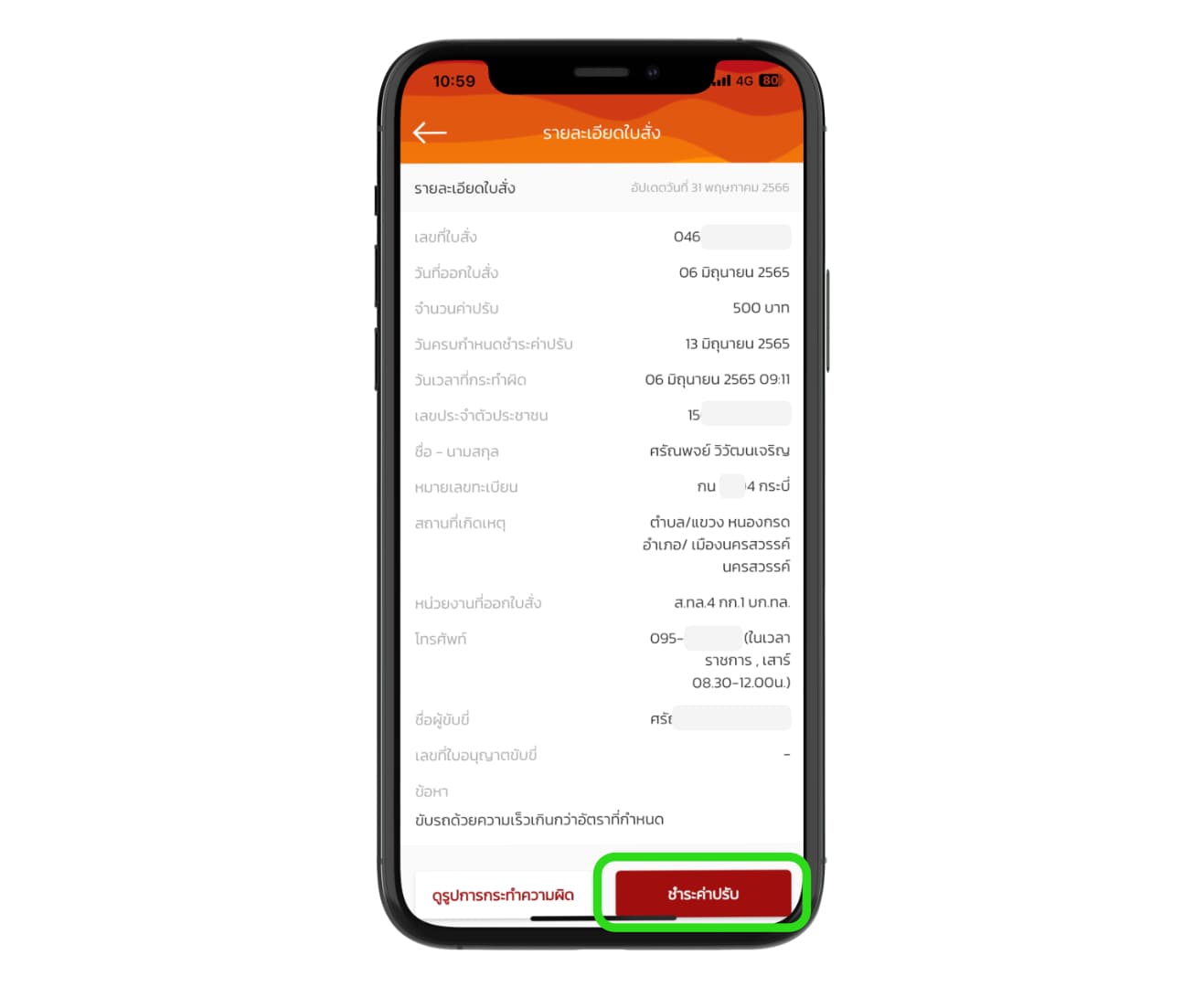 เราสามารถตรวจสอบได้ว่าใบสั่งออกเมื่อไหร่ โดนข้อหาอะไร ที่ไหนและเมื่อไหร่ ป้ายทะเบียนรถที่โดน และอื่น ๆ หากจะจ่ายค่าปรับก็สามารถแตะที่ปุ่ม “ชำระค่าปรับ” ได้เลย