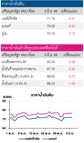 อย่างไรก็ตามหลังตลาดปิด สถาบันปิโตรเลียมด้านพลังงานสหรัฐฯ (API) เผยตัวเลขน้ำมันดิบคงคลังสหรัฐฯ ประจำสัปดาห์สิ้นสุด ณ วันที่ 2 มิ.ย. 66 ปรับตัวลดลง 1.7 ล้านบาร์เรล สวนทางกับที่นักวิเคราะห์คาดการณ์ว่าจะปรับเพิ่มขึ้น 1.0 ล้านบาร์เรล