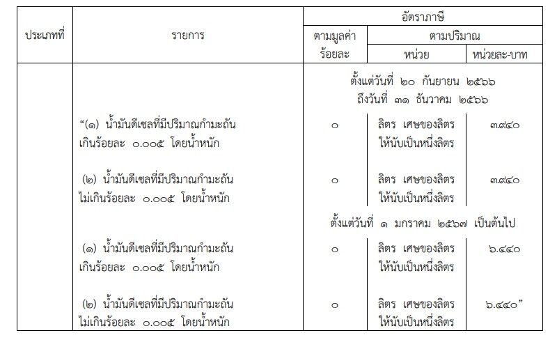 ข้อ 2 ให้ยกเลิกความใน (1) และ (2) ในประเภทที่ 01.05 น้ำมันดีเซล และน้ำมันอื่นๆ ที่คล้ายกัน ตอนที่ 1 สินค้าน้ำมันและผลิตภัณฑ์น้ำมัน ตามบัญชีท้ายกฎกระทรวงกำหนดพิกัดอัตราภาษีสรรพสามิต พ.ศ.2560 ซึ่งแก้ไขเพิ่มเติมโดยกฎกระทรวงกำหนดพิกัดอัตราภาษีสรรพสามิต (ฉบับที่ 34) พ.ศ.2566 และให้ใช้ความต่อไปนี้แทน (ตามตาราง)