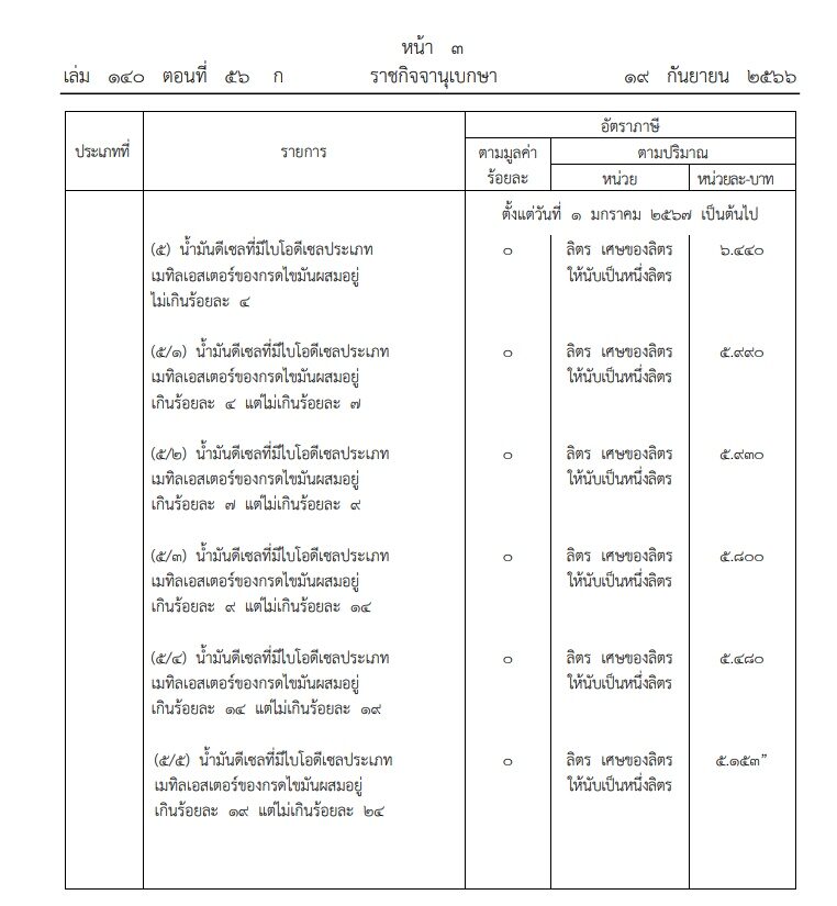 ข้อ 3 ข้อ ให้ยกเลิกความใน (5) (5/1) (5/2) (5/3) (5/4) และ (5/5) ในประเภทที่ 01.05 น้ำมันดีเซลและน้ำมันอื่นๆ ที่คล้ายกัน ตอนที่ 3 สินค้าน้ำมันและผลิตภัณฑ์น้ำมัน ตามบัญชีท้ายกฎกระทรวงกำหนดพิกัดอัตราภาษีสรรพสามิต พ.ศ.2560 ซึ่งแก้ไขเพิ่มเติมโดยกฎกระทรวงกำหนดพิกัดอัตราภาษีสรรพสามิต (ฉบับที่ 34) พ.ศ.2566 และให้ใช้ความต่อไปนี้แทน (ตามตาราง)