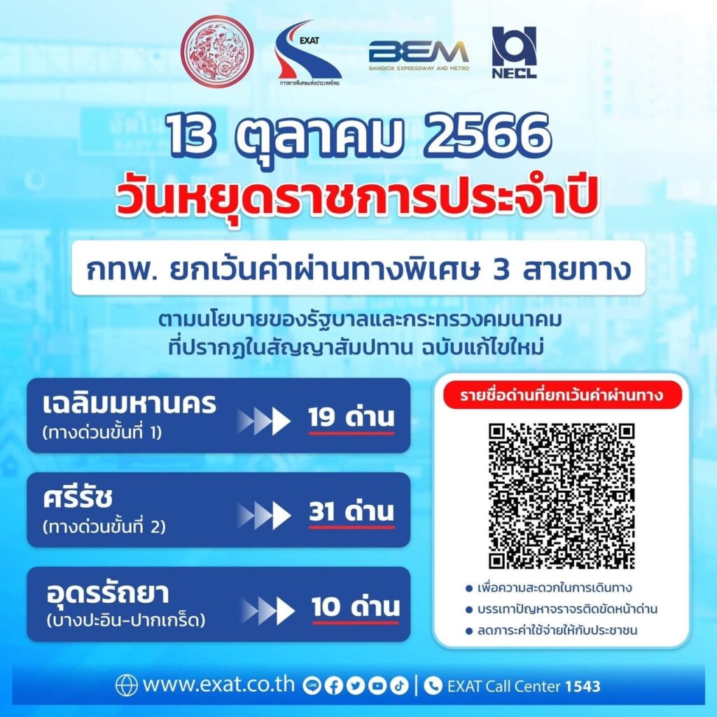 รายงานข่าวจากการทางพิเศษแห่งประเทศไทย (กทพ.) ระบุว่า กทพ. ยกเว้นค่าผ่านทางพิเศษของทางพิเศษ รวม 3 สายทาง ดังนี้ ทางพิเศษเฉลิมมหานคร (ทางด่วนขั้นที่ 1) จำนวน 19 ด่าน ทางพิเศษศรีรัช (ทางด่วนขั้นที่ 2) จำนวน 31 ด่าน และทางพิเศษอุดรรัถยา (บางปะอิน-ปากเกร็ด) จำนวน 10 ด่าน ในวันศุกร์ที่ 13 ตุลาคม 2566 (วันคล้ายวันสวรรคต พระบาทสมเด็จพระบรมชนกาธิเบศร มหาภูมิพล อดุลยเดชมหาราช บรมนาถบพิตร) ตั้งแต่เวลา 00.01 น. ถึง 24.00 น. ซึ่งเป็นวันหยุดราชการประจำปี ตามประกาศสำนักนายกรัฐมนตรี