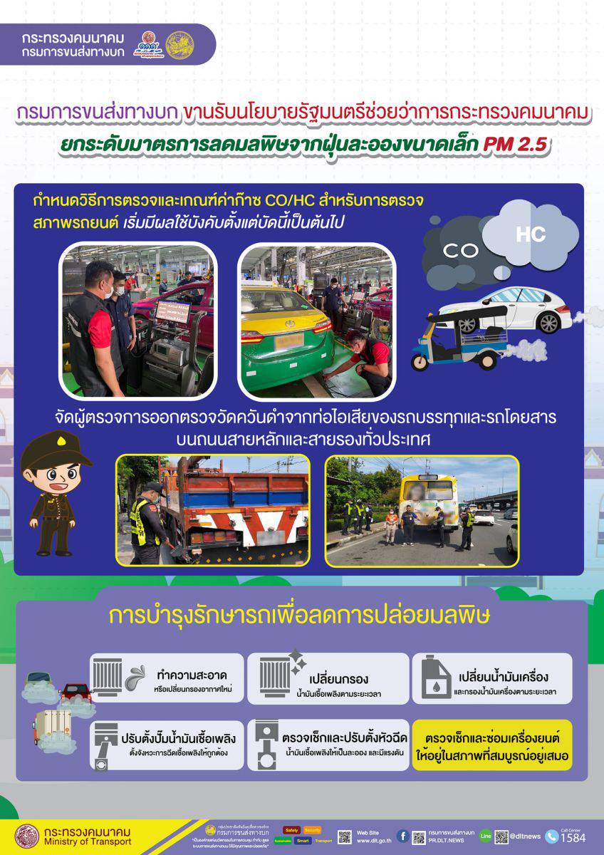 ขนส่งฯ ยกระดับมาตรการป้องกันและลดมลพิษ PM 2.5 จากภาคคมนาคมขนส่ง กำหนดวิธีการตรวจและเกณฑ์ค่าก๊าซ CO/HC สำหรับการตรวจสภาพรถยนต์ เริ่มมีผลใช้บังคับตั้งแต่บัดนี้เป็นต้นไป