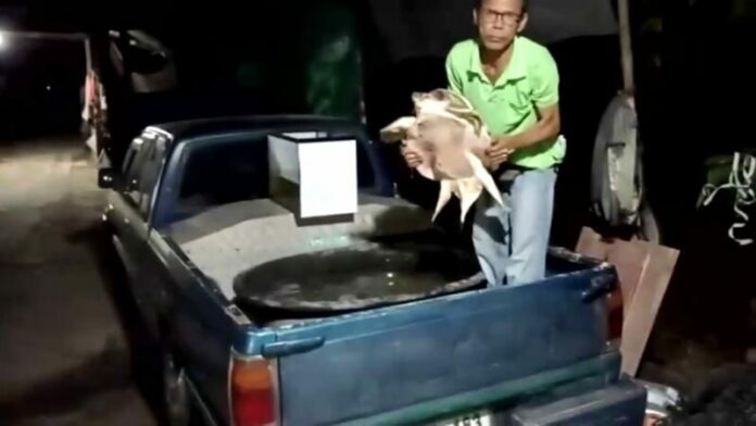 วันที่ 20 มี.ค. 66 ที่บ้านหลังหนึ่ง ม.6 ต.คลองอุดมชลจร อ.เมือง จ.ฉะเชิงเทรา นายสมนึก ศรีเมือง อายุ 56 ปี พนักงานขับรถสวนสาธารณะพระนคร เขตลาดกระบัง กทม. ช่วยเหลือเต่าประหลาดขนาดใหญ่ โดยได้เลี้ยงเต่าใส่น้ำในถังพลาสติกหลังรถกระบะ มาสด้า สีเขียว หมายเลขทะเบียน ผล 183 กรุงเทพมหานคร เต่ามีน้ำหนัก 14.5 กิโลกรัม ยาว 47 เซนติเมตร ความกว้างกระดอง 53 เซนติเมตร