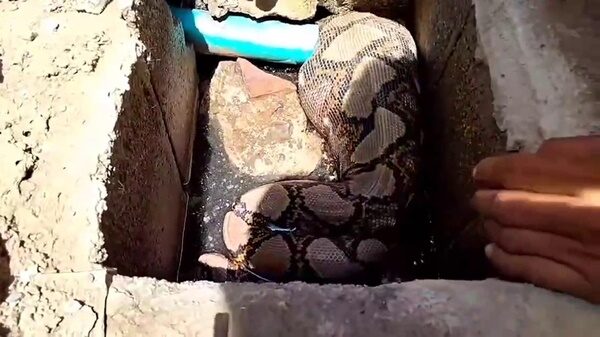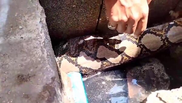 ท่อระบายน้ำ เรียกเพื่อนบ้านมาช่วยเปิดฝา แทบช็อก งูเหลือม ยาวเกือบ 4 เมตร ท้องใหญ่เหมือนเพิ่งกินแมวเข้าไป ติดอยู่เลื้อยไปไหนไม่ได้