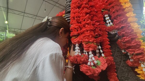 โดยปุยฝ้ายได้ยกเครื่องบูชาขอพรชุดใหญ่พร้อมพวงมาลัย เดินเวียนรอบพระตรีมูรติเทพแห่งความรักที่ใหญ่ที่สุดในประเทศไทย เดินเวียน 3 รอบ ก่อนจะไปกราบขอพรท้าวเวสสุวรรณ เปรียบเสมือนเทพเจ้าแห่งความร่ำรวย