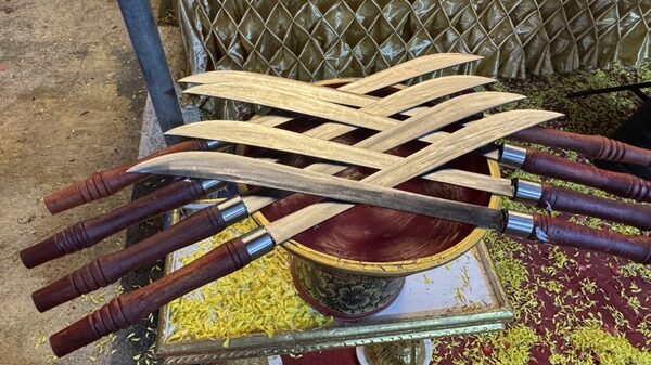 โดยแทงไปที่บริเวณท้อง, ลำคอ, ลำตัว, ข้างศีรษะ ทำให้ดาบนั้นงอและหัก ซึ่งก็เชื่อว่าจะเป็นการตัดเคราะห์และปราบสิ่งชั่วร้ายเช่นเดียวกัน ทำให้ประชาชนและลูกศิษย์ที่มาร่วมงานต่างพากันตื่นเต้นหวาดเสียวลุ้นตาม ๆ กัน หากพลาดถูกมีดดาบทิ่มแทงต้องบาดเจ็บหรือเสียชีวิตอย่างแน่นอน