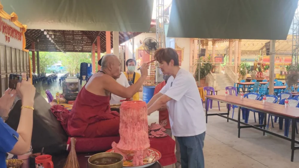 หนึ่งในผู้ที่เดินทางมาร่วมพิธีในวันนี้คือ เล็ก เจษฎา รุ่งสาคร นักแสดงชื่อดังที่ตั้งใจเดินทางมาเพื่อร่วมพิธีสาวน้ำตาเทียนและลงยันต์หลังมือกับหลวงพ่อแป๊ะ โดยเล็กได้เข้าคิวรอพิธีด้วยความตั้งใจ ก่อนจะได้รับการเจิมยันต์หลังมือทั้งสองข้างด้วยแป้งเสกจากหลวงพ่อแป๊ะ ซึ่งเป็นที่เชื่อกันว่าช่วยเสริมพลังงานบวกและโชคลาภ