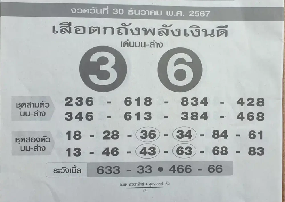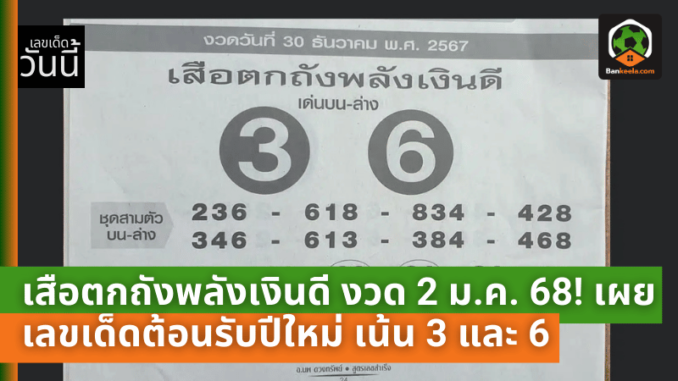 เสือตกถังพลังเงินดี งวด 2 ม.ค. 68! เผยเลขเด็ดต้อนรับปีใหม่ เน้น 3 และ 6 พร้อมเลขเบิ้ลลุ้นโชค