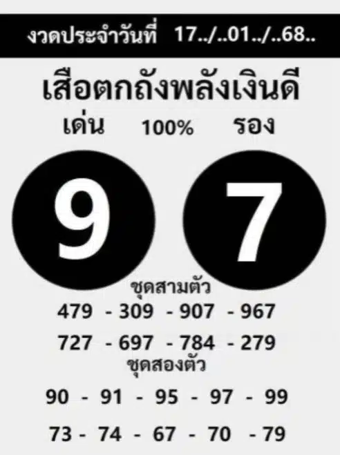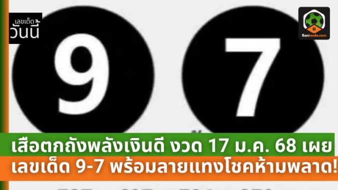 เสือตกถังพลังเงินดี งวด 17 ม.ค. 68 เผยเลขเด็ด 9-7 พร้อมลายแทงโชคที่คอหวยห้ามพลาด!