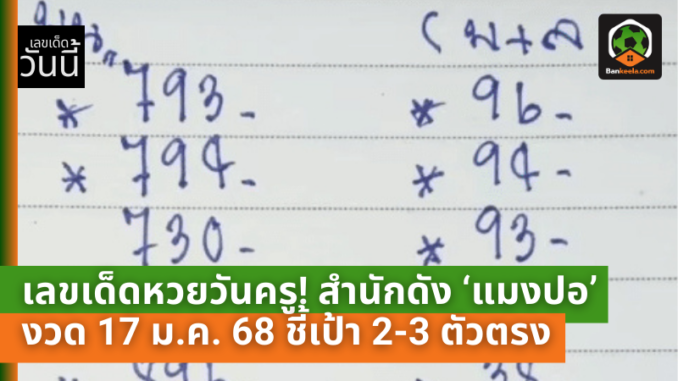 แนวทางเลขเด็ดจากสำนักแมงปอ งวด 17 ม.ค. 68