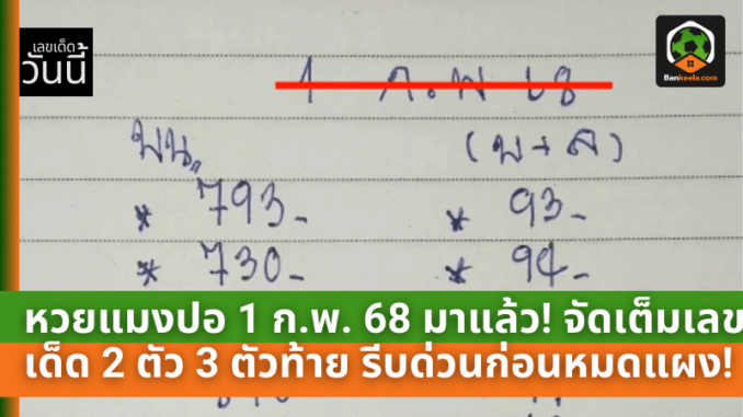 หวยแมงปอ 1 ก.พ. 68 มาแล้ว! จัดเต็มเลขเด็ด 2 ตัว – 3 ตัวท้าย รีบดูด่วนก่อนหมดแผง!