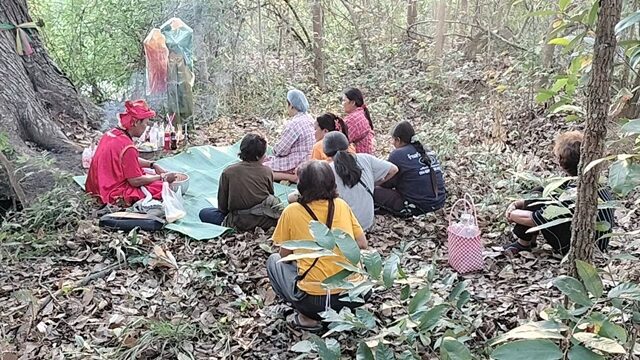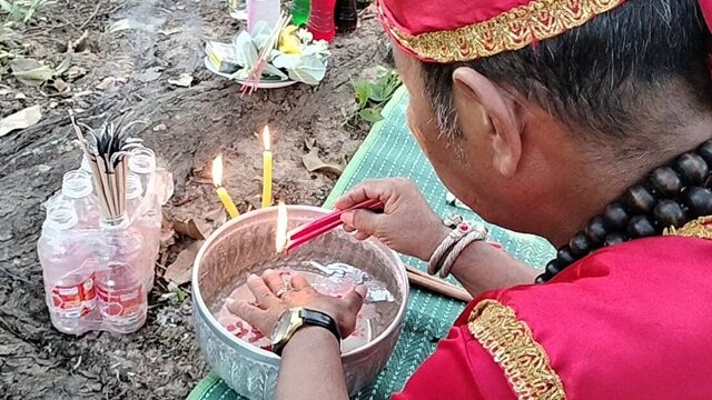 วันนี้จึงเชิญอาจารย์เริงมาทำพิธีที่ต้นตะเคียนคู่ อายุกว่า 100 ปี ขนาด 2 คนโอบ ซึ่งต้นตะเคียนที่นี่ เคยมีชาวบ้านมาขอโชคได้ไปแล้วหลายครั้ง โดยอาจารย์เริงเริ่มทำพิธีจุดธูปบอกกล่าวเจ้าที่เจ้าทางให้เปิดโชคเปิดลาภ แล้วหยดน้ำตาเทียนสีแดงลงในขันน้ำมนต์