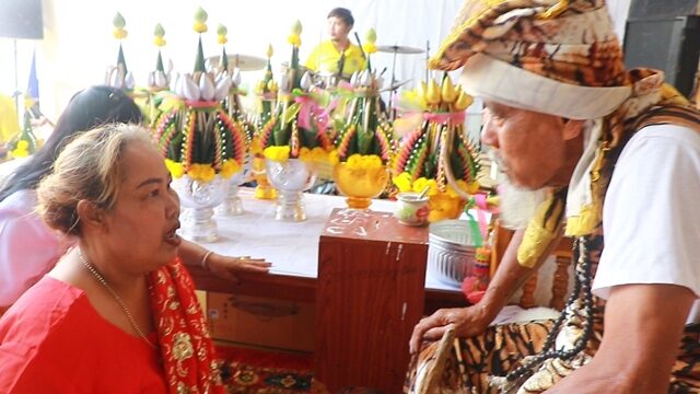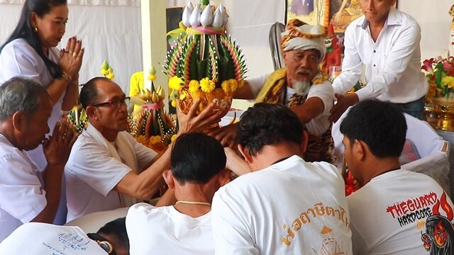 เมื่อถึงเวลา 09.00 น.ซึ่งเป็นฤกษ์ดี จึงได้จัดเตรียมเครื่องเซ่นไหว้ต่าง ๆ ตั้งไว้บนปรัมพิธี ที่มีวัตถุมงคลต่าง ๆ ตั้งเรียงรายเอาไว้โดยเครื่องเซ่นไหว้ ประกอบด้วย หัวหมู 20 หัว ไก่ 9 ตัว ไข่ต้ม 200 ฟอง รวมถึงเครื่องดื่ม สุรา และผลไม้หลายอย่าง บายศรีชนิดต่าง ๆ เป็นเครื่องเซ่นไหว้ในการทำพิธีครั้งนี้