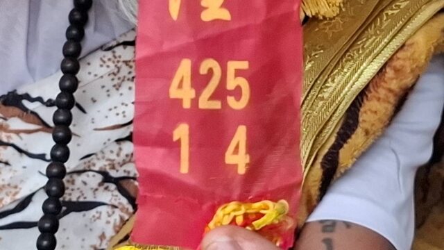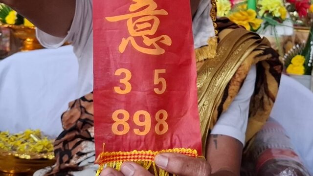 เมื่อทำพิธีเสร็จสักครู่ ร่างทรงจึงตะโกนเสียงดังสนั่นสั่งให้ลูกศิษย์ทำการจุดประทัด 2 ชุดพร้อมกันเพื่อเป็นการเสี่ยงทายตัวเลขหางประทัด ชุดแรกจำนวน 500 นัด ชุดที่ 2 จำนวน 10,000 นัด เมื่อสิ้นเสียงประทัดเลขหางประทัดชุดแรก ที่ได้คือ 4 2 5 และ 4 1 ส่วนประทัดชุดที่ 2 ปรากฏตัวเลขหางประทัดคือ 3 5 และ 8 9 8