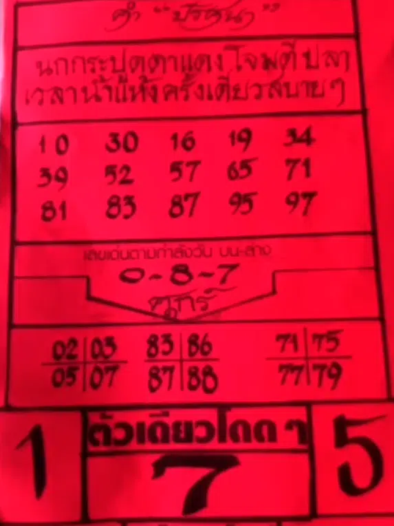 - เลขท้ายสองตัว ชุดที่ 1 : 10 – 30 – 16 – 19 – 34 – 39 – 52 – 57 – 65 – 71 – 81 – 83 – 87 – 95 – 97