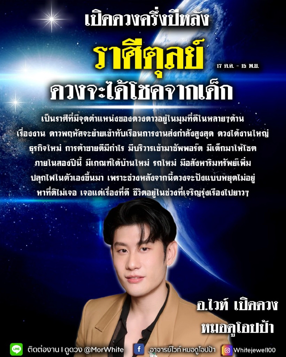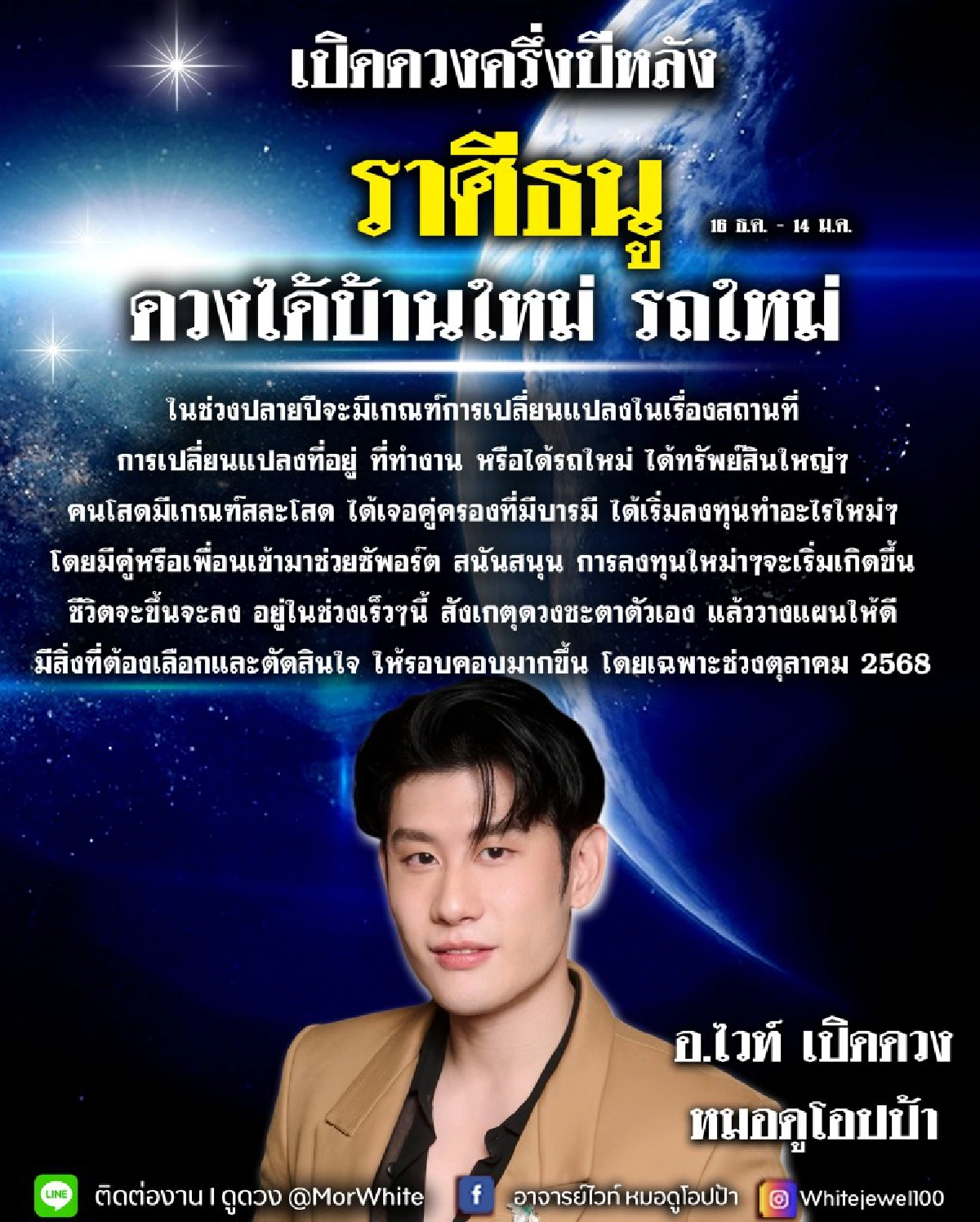 นักพยากรณ์ดัง "หมอไวท์" ดูดวงวันนี้ 2 ราศี ครึ่งปีหลังสุดปัง มีเกณฑ์ได้บ้านใหม่ รถใหม่ ได้ทรัพย์สินใหญ่ๆ ดวงจะได้โชคจากเด็ก