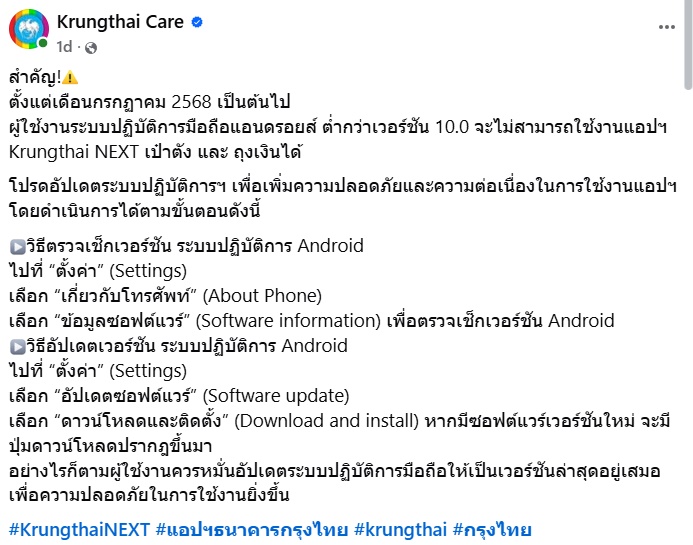 วันที่ 18 มิถุนายน 2568 เฟซบุ๊ก Krungthai Care มีการโพสต์ประกาศสำคัญ เตือนคนใช้แอปฯ Krungthai NEXT เป๋าตัง และ ถุงเงิน มีโอกาสที่จะใช้แอปฯ ไม่ได้ในเดือนกรกฎาคม มีรายละเอียดดังนี้